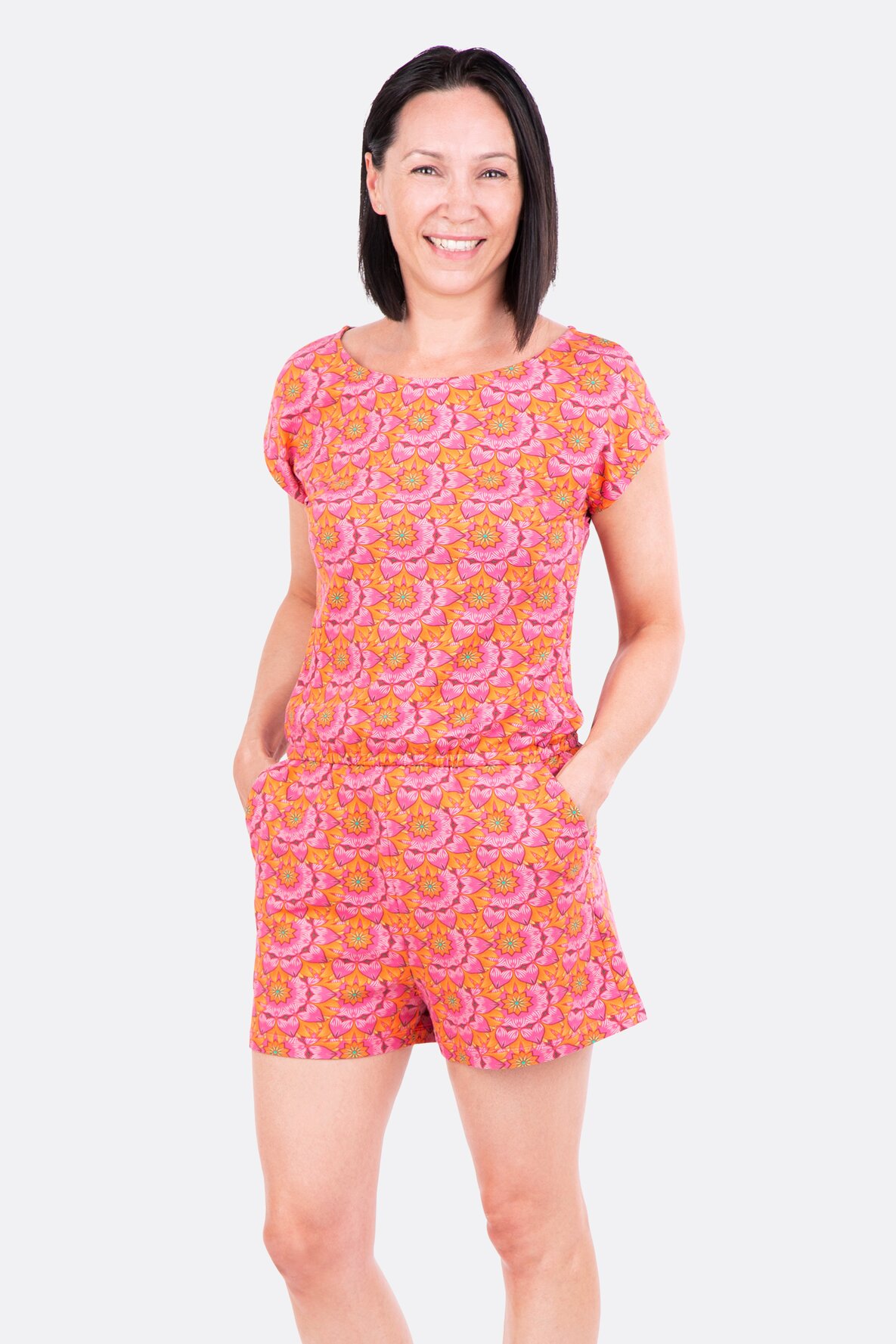 Nähe dir mit dem Schnittmuster „Joy“ einen Jumpsuit aus Jersey zum Reinschlüpfen und Wohlfühlen! Von sportlich über romantisch bis bürotauglich – mit deiner Stoffwahl bestimmst du den Look. Das Schnittmuster enthält 2 Oberteile (Kurzarm-Shirt + Top) und zwei Hosen (lange Hose + Shorts). Zusätzlich kannst du das Oberteil mit einer Passe nähen und in den Ausschnitt einen Verschluss zum bequemen An- und Ausziehen einarbeiten. Der schmale Tunnelzug mit Gummiband sorgt für Halt und Bequemlichkeit.